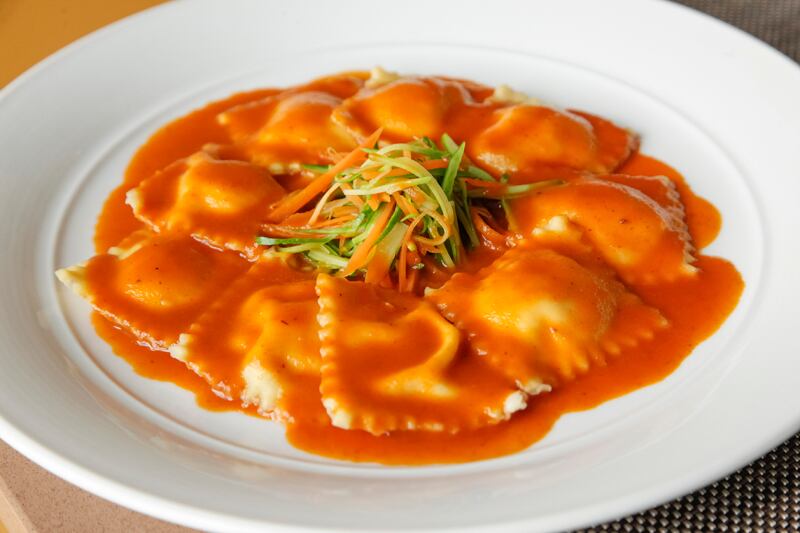 Raviolis de langosta caribeños. Con caldo de crustáceos con leche de coco y curry tailandés. La salsa con un sabor picante liviano; textura en su punto y el relleno, de gusto delicado. Muy del agrado de nuestra invitada.