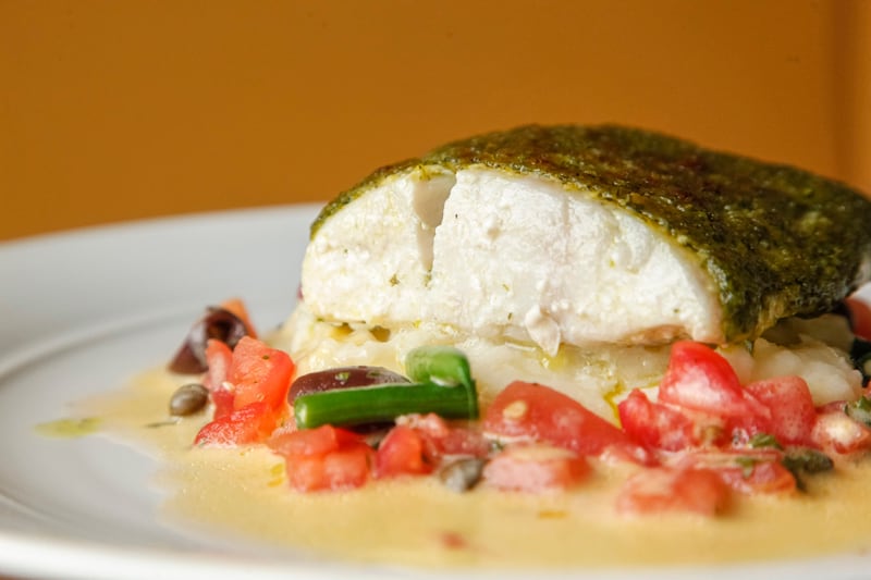 Corvina reina al horno con costra verde de yerbas aromáticas, sentada sobre puré, con aceitunas, alcaparras y vainicas. Salsa de mantequilla avellanada. Una sorpresa para la vista y realmente exquisito, se leía la palabra “fresquísimo” en cada bocado. A mencionar especialmente la tonalidad de la costra de yerbas en el paladar.