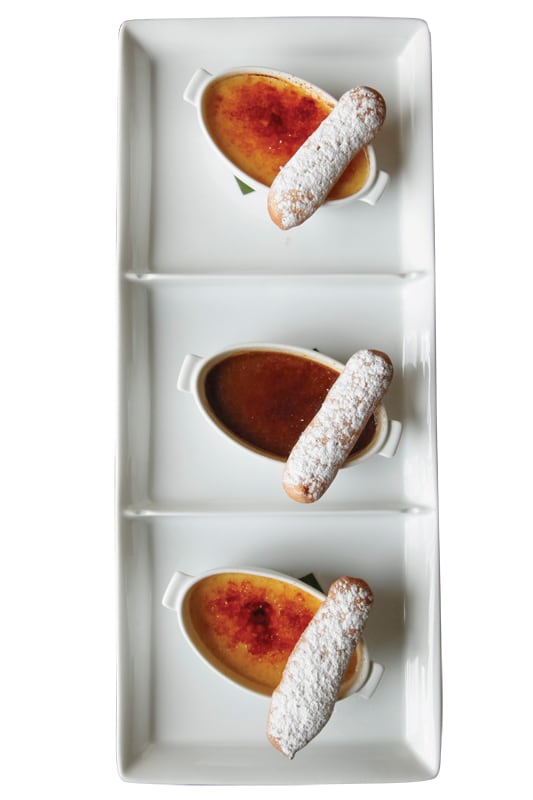 Trío de crème brulée (de vainilla, naranja y café), adornado con dedos de señora. Bien logrado, nos gustó más la de naranja, pero ninguna desmereció.