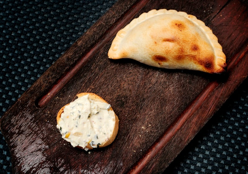 Empanada de cebolla y queso . Las empanadas tienen una masa crujiente, nítido el sabor de la cebolla y queso abundante.