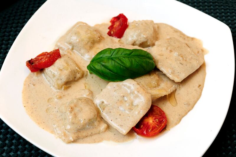 Ravioli de ossobuco en salsa de ossobuco. Fuera de serie. Un plato original que no suele aparecer en las cartas y tiene una personalidad muy marcada. Una porción de seis raviolis con buen tamaño.