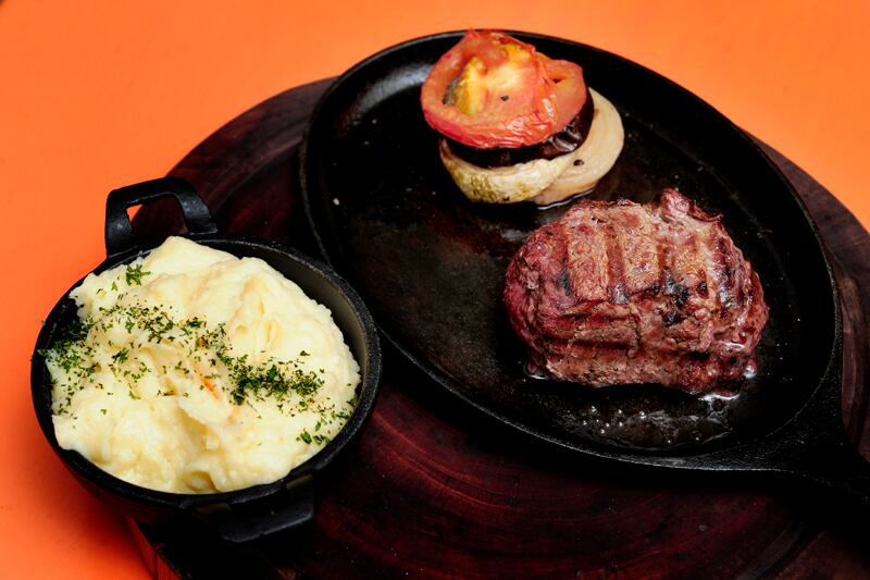 Lomito al plato con puré y vegetales a la parrilla . La carne se pidió término medio y llegó justo así. El puré de muy buen sabor y de confección perfecta.