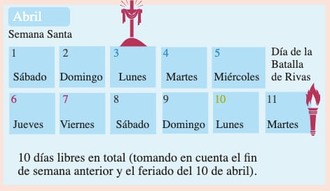 Específicamente para esta Semana Santa, sucede un asunto particular porque al concluir estas fechas, llega el feriado del 11 de abril que conmemora el Día de la Batalla de Rivas.