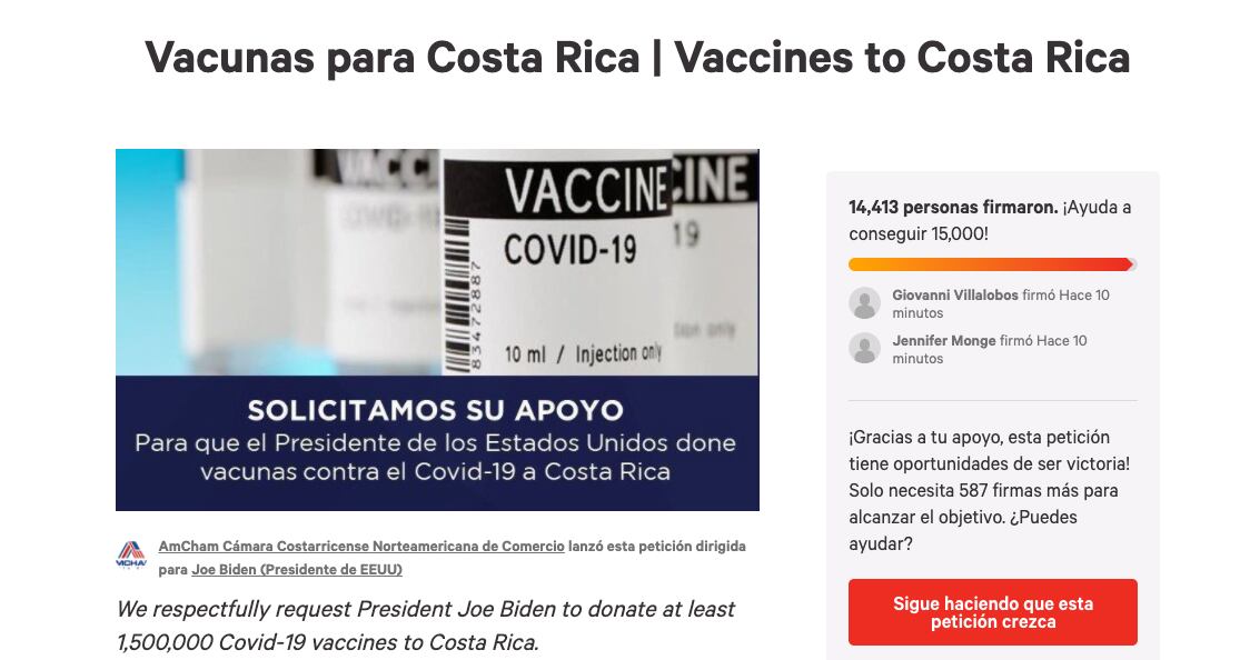 El pasado 10 de mayo, la Cámara Costarricense Norteamericana de Comercio (AmCham) inició una recolecta de firmas para solicitar al gobierno de Estados Unidos la donación de 1,5 millones de vacunas para acelerar el proceso de vacunación en el país.