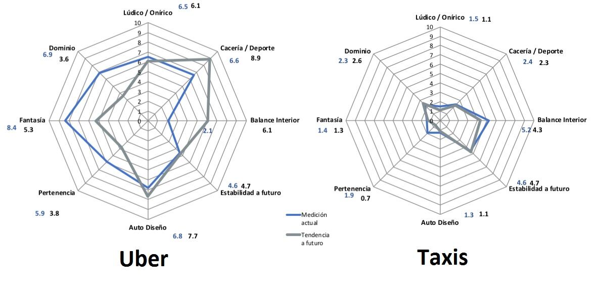 ¿Cómo se ve esto en resultados? Por ejemplo, al construir el gráfico de drivers para Uber y para el servicio de taxis rojos, queda en evidencia la relación entre el consumo de Uber y motivaciones emocionales positivos, en un porcentaje mucho mayor al que provoca el consumo del servicio de taxis.