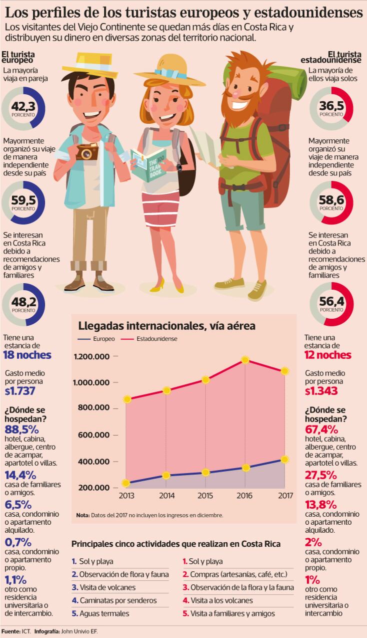 Datos del Instituto Costarricense de Turismo (ICT) muestran que hace ocho años ingresaron 225.996 europeos a Costa Rica, vía aérea,mientras que, el año pasado fueron 342.484, sin contar los registros de diciembre –aún no disponibles–.