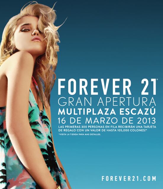 El próximo sábado 16 de marzo es el día oficial de apertura en Costa Rica de la famosa cadena de tiendas estadounidenses Forever 21 en el centro comercial Multiplaza Escazú.