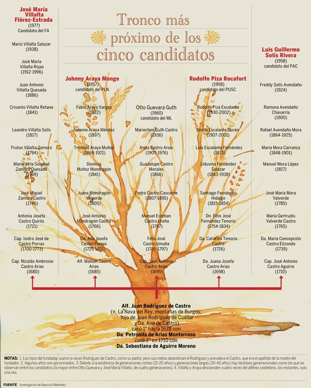 En un país tan pequeño como Costa Rica y con una historia moderna que se inició hace poco (1561), no tiene nada de extraño que todos seamos primos –en un sentido amplio del término, por supuesto–, sin embargo, siempre sorprende que resulten ser familia personas con posiciones ideológicas radicalmente distintas y con historias de vida muy diferentes también. Por eso llama la atención que los cinco candidatos a la presidencia con mayor intención de voto, de quienes EF preparó sus genealogías, resulten ser parientes.