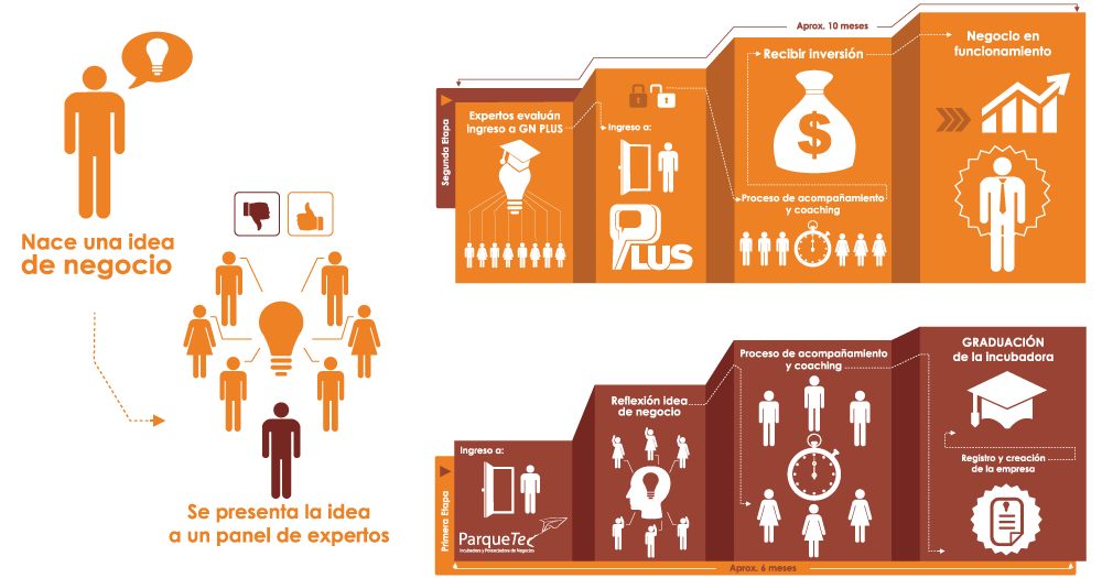 A la última etapa llegan los emprendimientos que culminan con éxito el proceso preliminar de incubación. Se seleccionan los que tengan la oportunidad de acelerar sus empresas en GN Plus y puede extenderse por 10 meses hasta identificar que el negocio está listo para salir al mercado.
