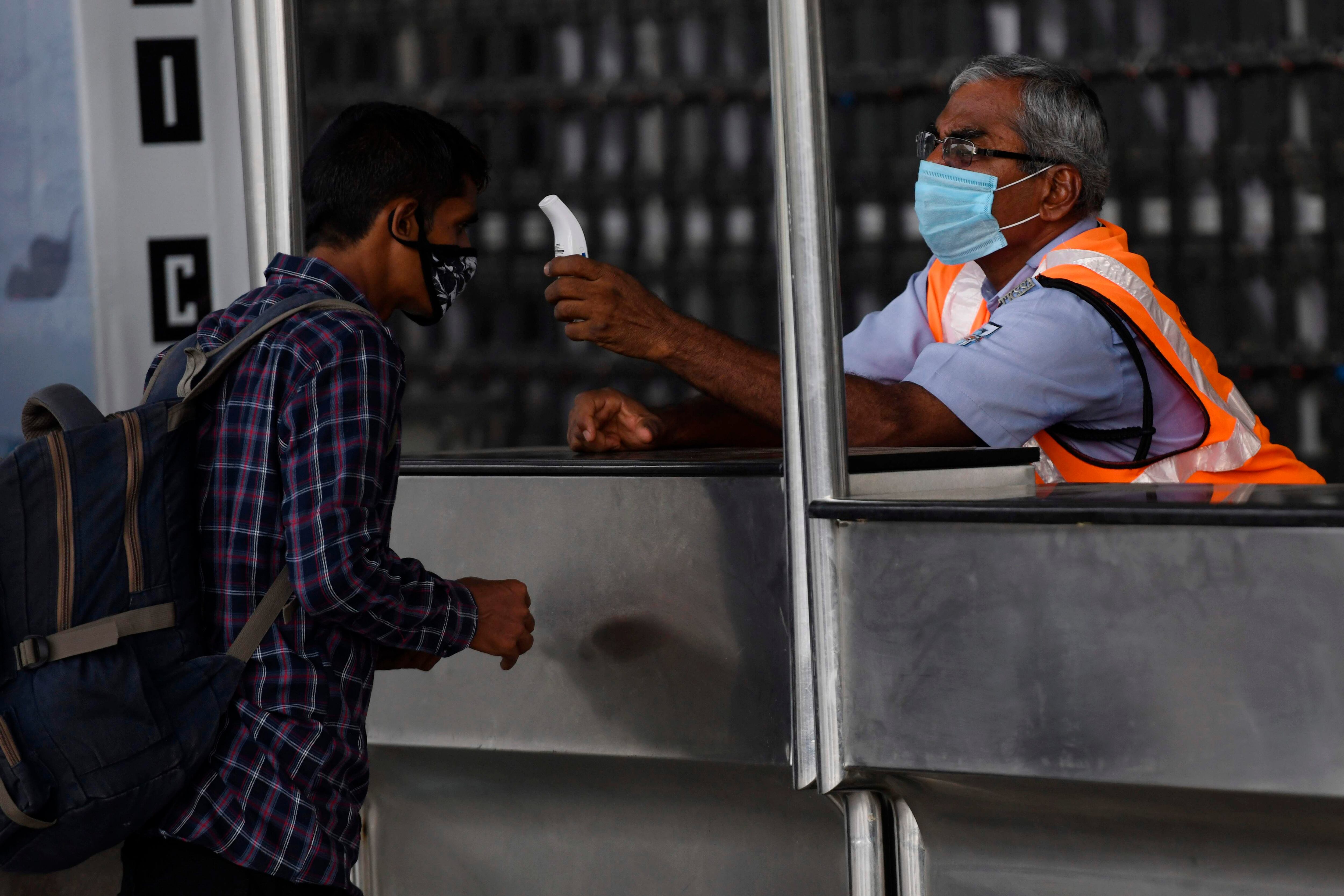 En el aeropuerto de Nueva Delhi, los agentes de seguridad toman la temperatura de los pasajeros y verifican que tengan en el teléfono la aplicación de seguimiento del gobierno Aarogya Setu.