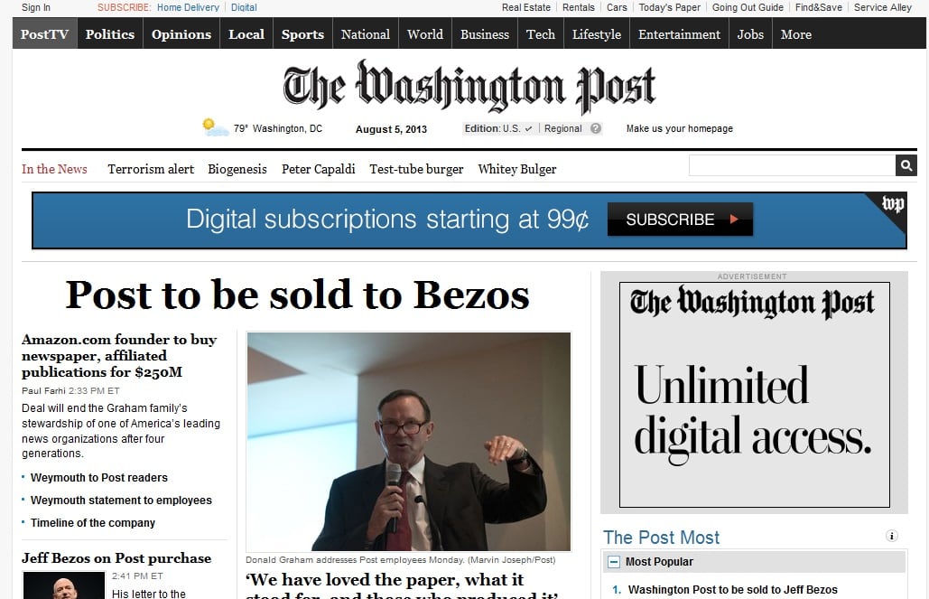 Amazon, con sede en Seattle, no tendrá ningún papel en la adquisición y Bezos se convertirá en el único propietario del Post cuando se complete la venta, probablemente dentro de 60 días. La transacción se mantuvo en secreto hasta hoy.