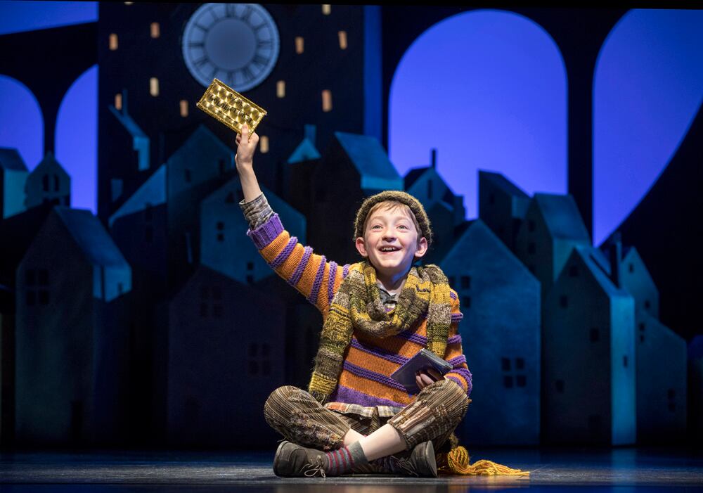 Así que, dentro del Lunt-Fontanne en la Calle 46 Oeste, una tienda Dylan’s temporal domina el vestíbulo. Hay muchas referencias a Willy: las barras de chocolate de Dylan’s tienen envolturas doradas; se ofrecen boletos dorados de recuerdo, y las bolsas de compra son moradas (el color del abrigo de Wonka) con una gran W dorada.