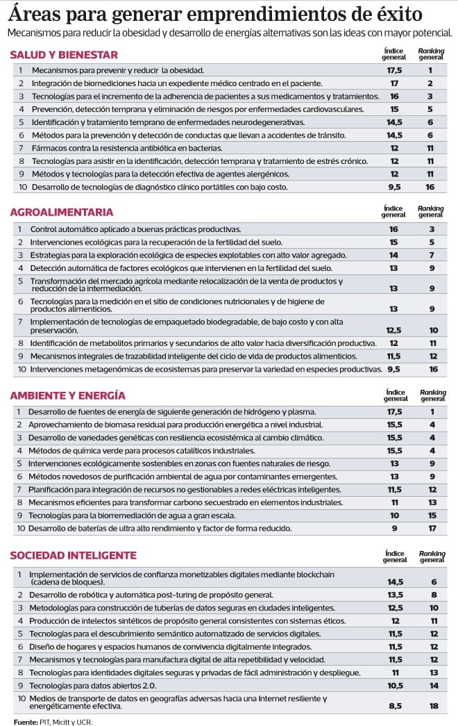 Para definir las 40 fronteras con potencial de negocio,la Agencia Universitaria para la Gestión del Emprendimiento (Auge) de la UCR y la Unidad de Gestión y Transferencia del Conocimiento para la Innovación (Proinnova) trabajaron conel consultor Santiago Núñez y determinaron un índice de factibilidadde emprendimiento.