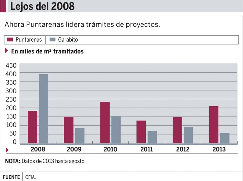 Aún así, las cosas no son como antes. Datos del Colegio Federado de Ingenieros y Arquitectos (CFIA), indican que hace cinco años se había tramitado un 53% más de metros cuadrados en Puntarenas y Garabito.