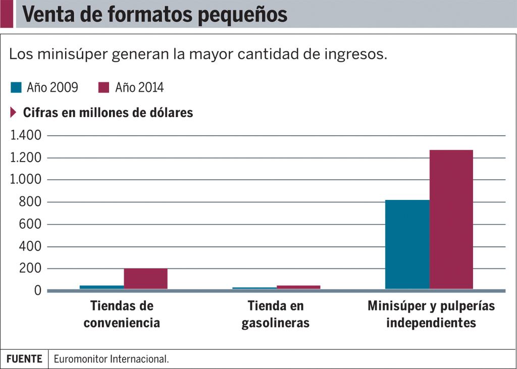 Ante un aumento exponencial en las ventas del 509% en los formatos tipo Vindi, AM PM y Fresh Market, y un 109% en tiendas de servicentros o gasolineras como Delta, los minisúper registran un ascenso del 56% del 2009 al 2014, según datos de Euromonitor Internacional.