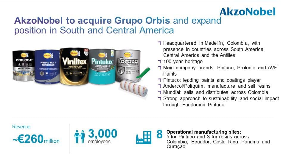 AkzoNobel, una firma en la industria de pinturas ―con sede en los Países Bajos― adquirió las operaciones de la compañía colombiana de pinturas y revestimientos Grupo Orbis, la cual agrupa empresas como Pintuco, Andercol y Poliquim (resinas) y Mundial (distribución y servicios).