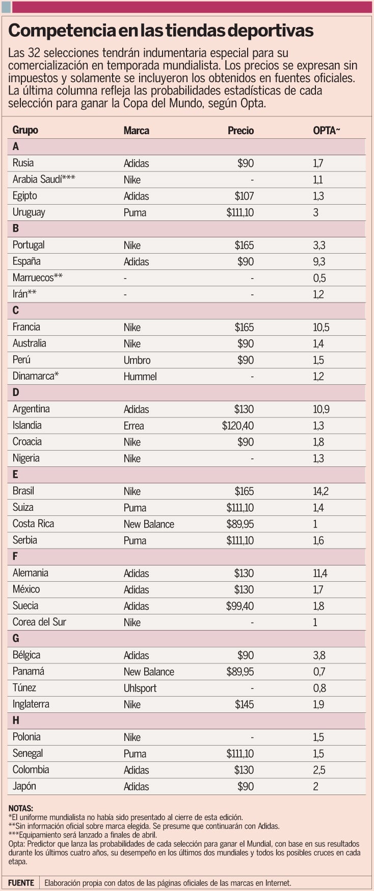 En Rusia 2018, Adidas y Nike mantendrán su cuota histórica y sus representantes más tradicionales. El caso de Puma es diferente: hay bajas sensibles en sus chances de exposición, pues quedaron fuera de la fase final las selecciones de Camerún, Costa de Marfil y Ghana, y su elemento estrella, Italia. ( recuadro “Competencia en las tiendas...”)