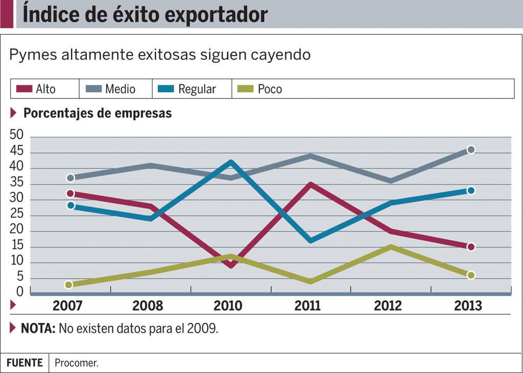 Solo un 15% de las micro, pequeñas y medianas empresas (mipymes) que exportan en Costa Rica son consideradas como altamente exitosas y esa cantidad ha venido bajando desde el 2011.