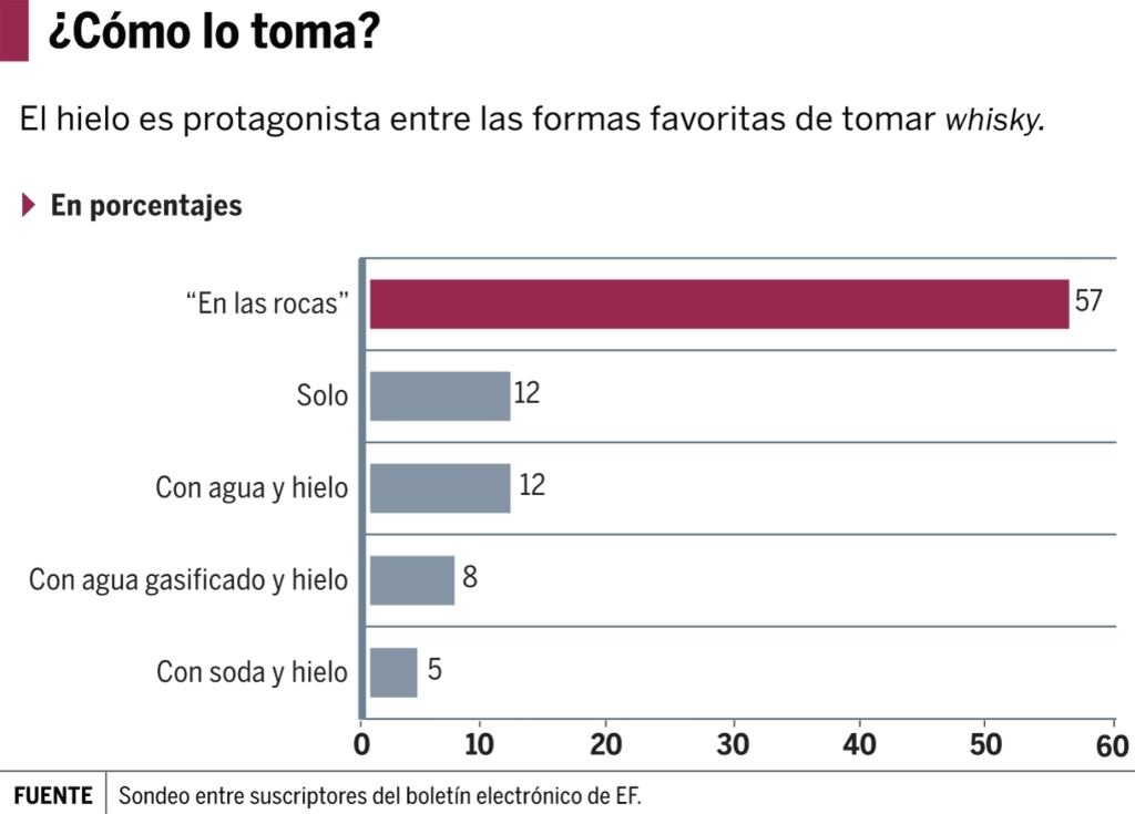 Al consultarles por qué prefieren una marca en lugar de otra, la respuesta generalizada fue el sabor agradable, con algunas menciones de la relación precio-calidad. Y a la hora de explicar cómo prefieren tomarlo, casi seis de cada 10 participantes bebe el whisky con hielo. Tome en cuenta que una fiesta con aficionados a esta bebida requerirá una provisión alta de ese elemento.