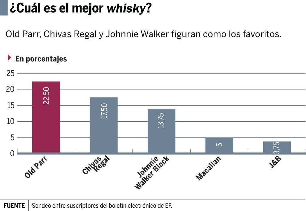 Al sumar todas las menciones de Johnnie Walker -votado en sus presentaciones Swing (2,5%), Double Black (1,25%), Green Label (1,25%), Gold Label (1,25%) y Platinum Label (2,5%), esta marca alcanza el 22,5% de las preferencias. Con las menciones específicas a sus presentaciones Grand (2,5%) y de 12 (5%) o 18 años (1,25%), Old Parr llega a 31,25%. Y si sumamos las preferencias por Chivas Regal 12 (1,25), 18 (2,5) y 21 años (1,25), alcanzan el 22,5% del total.
