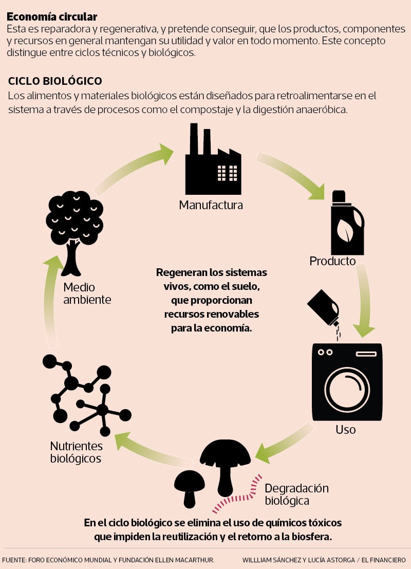 La economía circular, según define la Fundación The Ellen MacArthur, es reparadora y regenerativa, y pretende conseguir que los productos, componentes y recursos en general mantengan su utilidad y valor en todo momento.