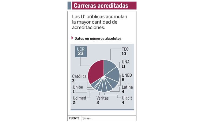 De acuerdo con datos del Sistema Nacional de Acreditación Superior (Sinaes), las cuatro instituciones públicas son las que tienen más carreras acreditadas y solo seis de todas las privadas del país tienen entre 1 y 4 carreras con esta distinción.