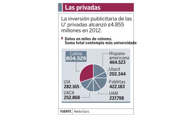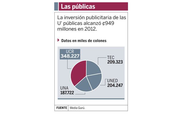 De los cuatro centros de enseñanza, la UCR es la que más invirtió en publicidad en el 2012, según la firma Media Gurú, al pautar ¢348, 2 millones.