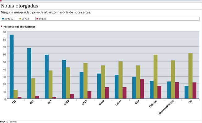 Un 58,7% otorgó la calificación más alta a la Universidad Nacional (UNA) y un 51,6% a la Universidad Estatal a Distancia (UNED).