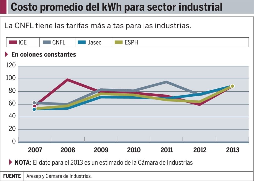 Del 2009 al 2012, las tarifas eléctricas del sector industrial cayeron un 11,7% en promedio, según datos de la Autoridad Reguladora de Servicios Públicos (Aresep).