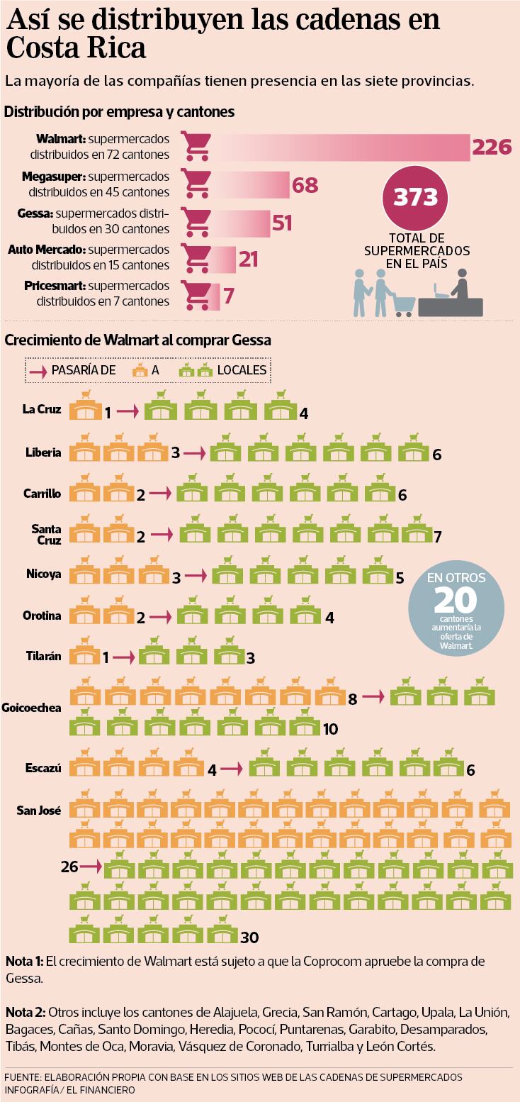 Walmart –con sus formatos Masxmenos, Palí y Maxipalí– registra actualmente 226 locales ubicados en 72 cantones. De aprobarse la compra, pasaría a tener 277 puntos de venta en 73 cantones (agrega a León Cortés).