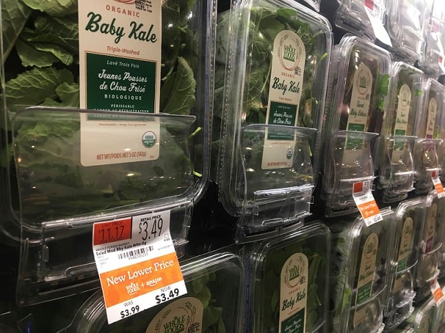 El medio galón de leche estaba 50 centavos más barato en una tienda Whole Foods en Nueva York. La carne molida bajó a $2 la libra. Los aguacates orgánicos, el pollo asado, los huevos orgánicos y la col rizada también se abarataron.