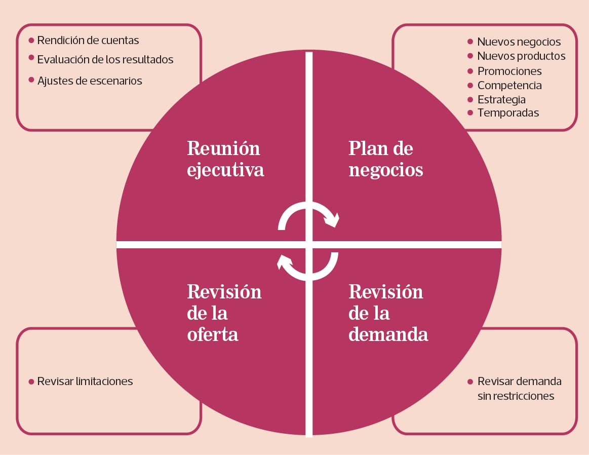 De acuerdo con la metodología que se aplica en la Planeación de las Ventas y las Operaciones (S&OP, por sus siglas en inglés), hay que seguir los pasos que muestra la ilustración adjunta.
