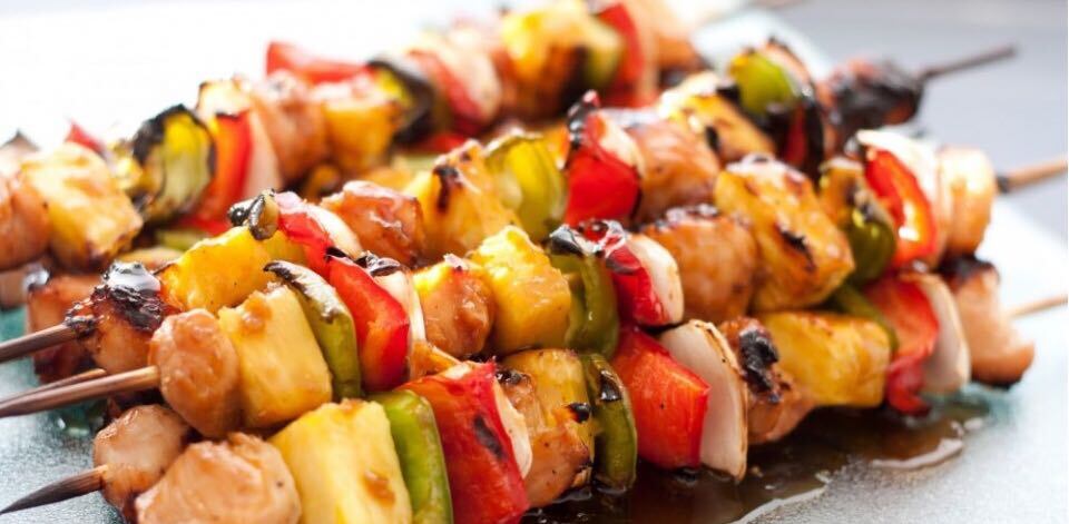 También se cocinan pinchos de pollo o de carne y se ofrecen acompañamientos, que incluyen vegetales a la parrilla, como berenjena, zucchini y zanahoria.