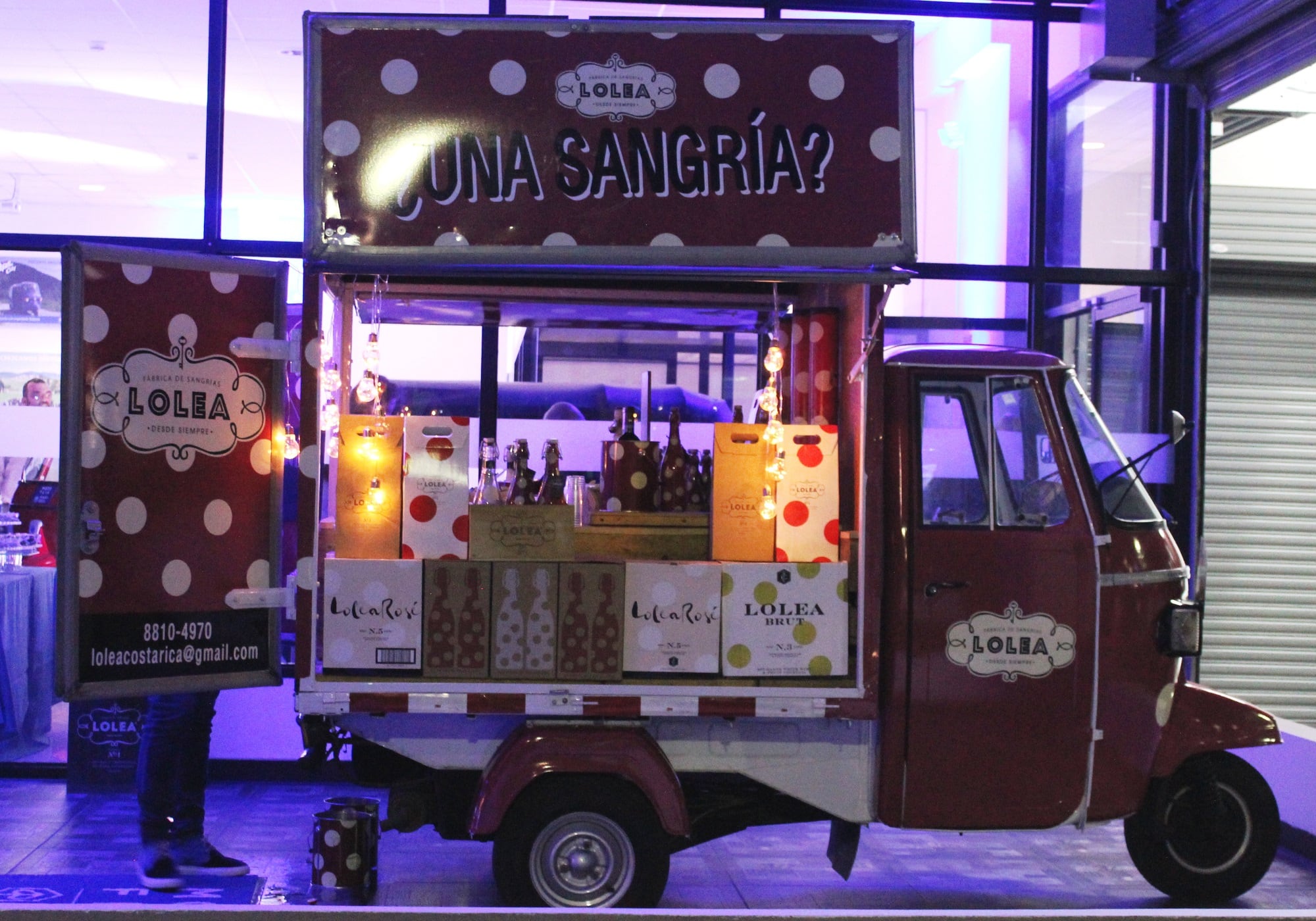 Además, las luces del carro se diseñaron de forma tal que parezcan pestañas, se le pusieron luces rústicas de color amarillo y las mismas cajas de la sangría sirven de decoración (como una bodeguita).