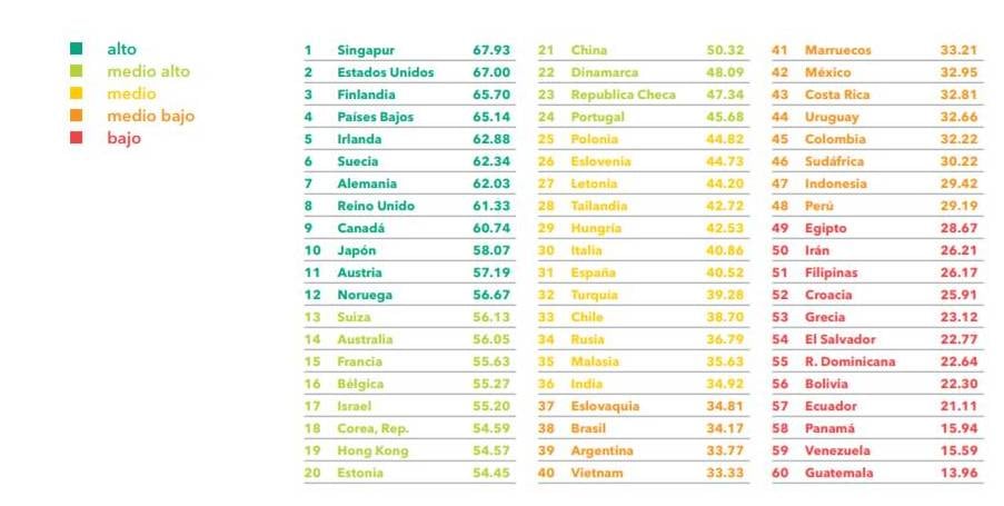 Singapur, Estados Unidos, Finlandia, Países Bajos, Irlanda, Suecia, Alemania, Reino Unido, Canadá, Japón, Austria y Noruega son las naciones que están mejor calificadas y que tienen un nivel “alto”.