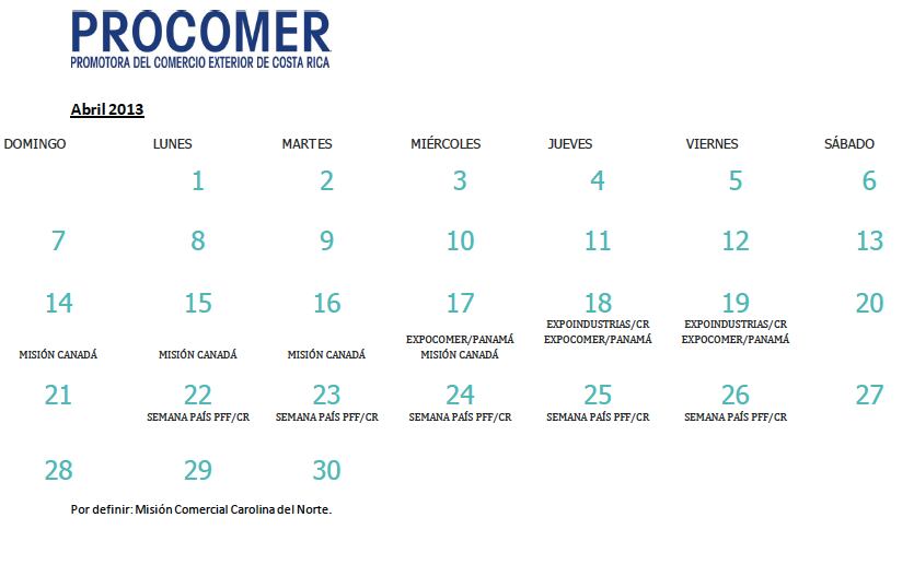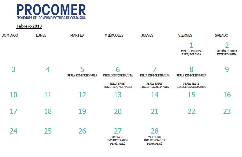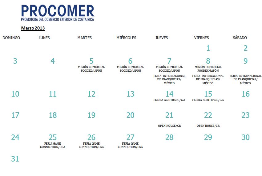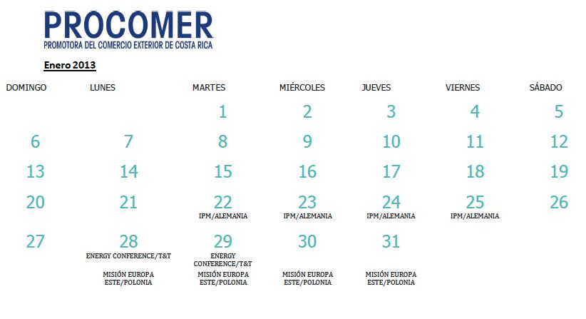 En el primer mes del año Costa Rica ya ha participado en dos ferias internacionales mediante la representación de un pabellón país, patrocinado y dirigido por la Promotora del Comercio Exterior (Procomer). Estas fueron " IPM Essen 2013", dirigida al sector de plantas, flores y follajes, y la Energy Conference 2013, dirigida al sector de metalmecánica. Para el resto del cuatrimestre, la agenda incluye otros seis eventos de este tipo (véase en galería el Calendario Procomer), para diversos sectores.
