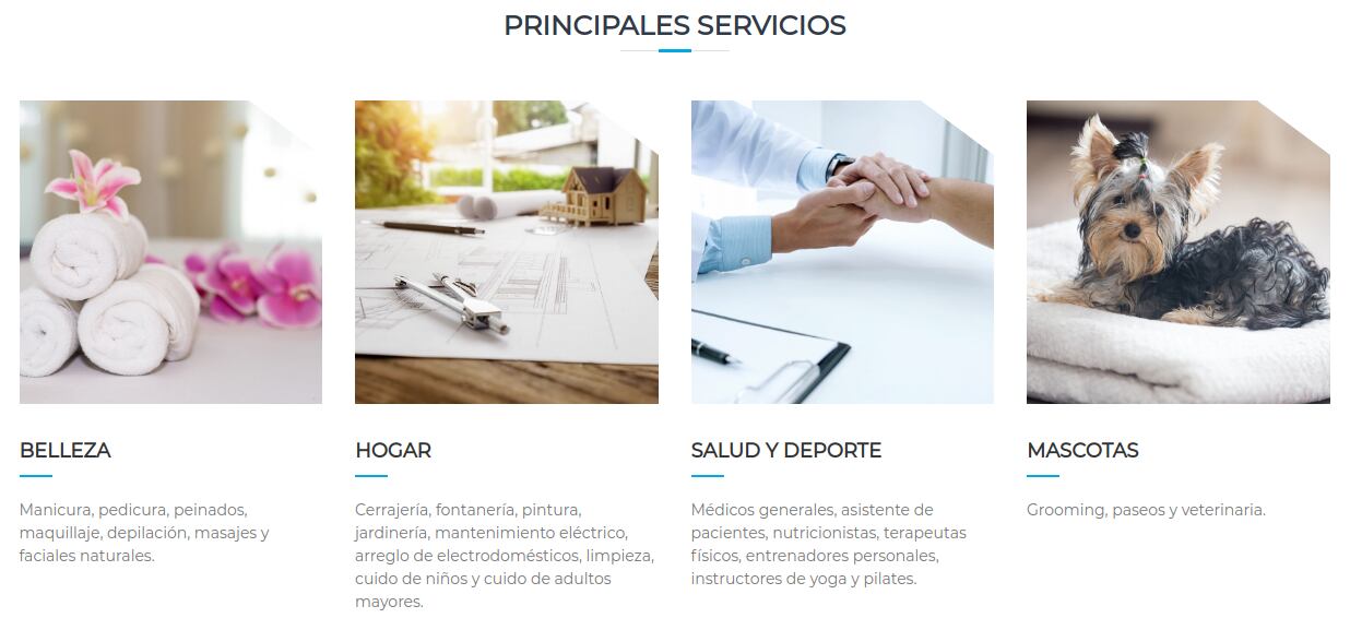 Las categorías incluyen alimentos, autos, entretenimiento (mariachis, payasos, grupos de musica), catering services, hogar (cerrajería, domésticos, veterinarios), deportes (yoga, clases a domicilio), servicios médicos, servicios profesionales (contabilidad, por ejemplo), arreglos florales, costura y asistente de compras.