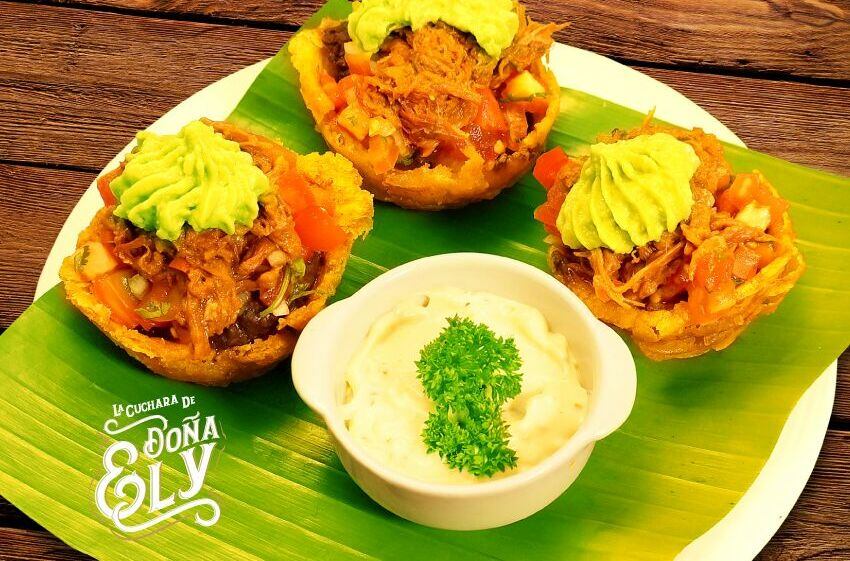 También hay canastitas de patacón, hechas de plátano verde o maduro, que se rellenan con carne mechada, frijoles molidos, chimichurri y guacamole.