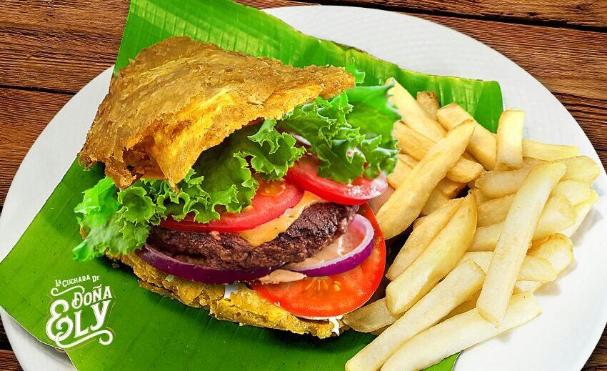 La patacón burguesa abarca dos patacones grandes con torta de carne, lechuga, tomate, pepinillos, jamón y queso, con papas a la francesa.