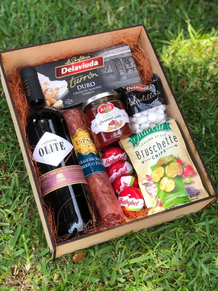 Se ofrecen también las cajas tradicionales con vino, sangría y productos gourmet, así como cajas de productos artesanales, como las que se están preparando para el próximo Día de la Madre (que incluye jabón artesanal, velas, compresa y repostería).