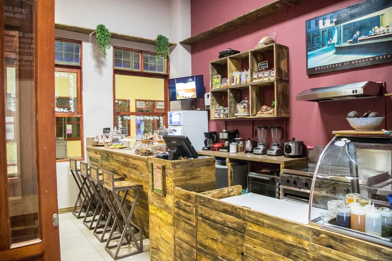 En él ofrece hamburguesas vegetarianas y veganas, sándwiches, waffles con frutas, ensaladas, quesadillas, repostería, papas, camote, quesos hechos de marañón y tofu.