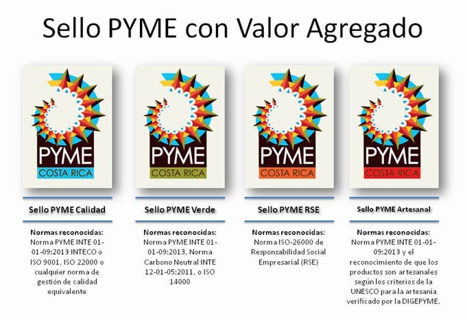 Sello Pyme Calidad: color azul. Debe tener la Norma PYME INTE 01-01-09:2013 o la ISO 9001; o la ISO 22000 o cualquier norma de calidad equivalente.