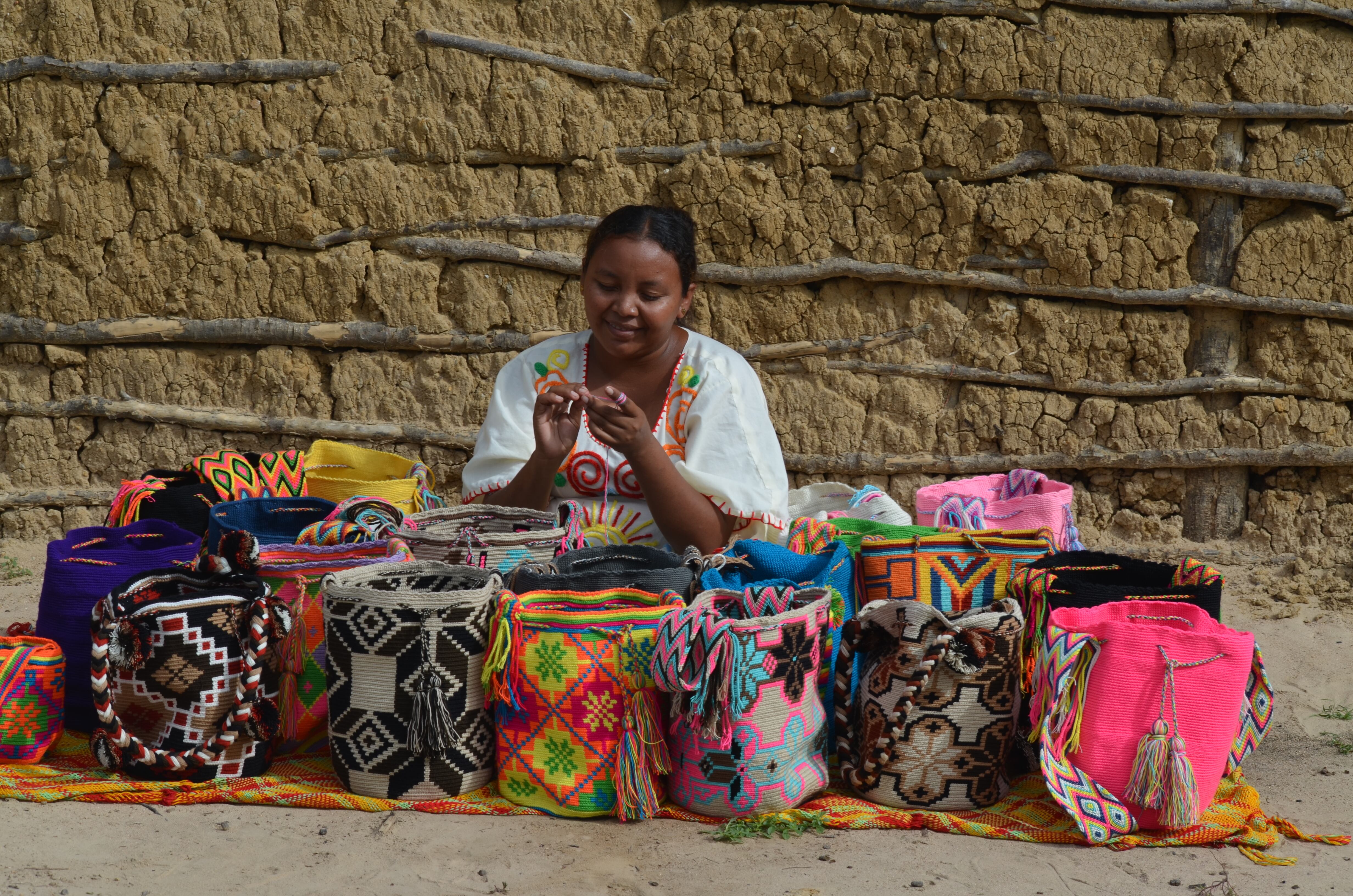 Por ejemplo, parte de las mujeres que se han visto beneficiadas son indígenas wayúu que viven en el Desierto de La Guajira, quienes tejen bolsos en los que plasman la historia de su región.