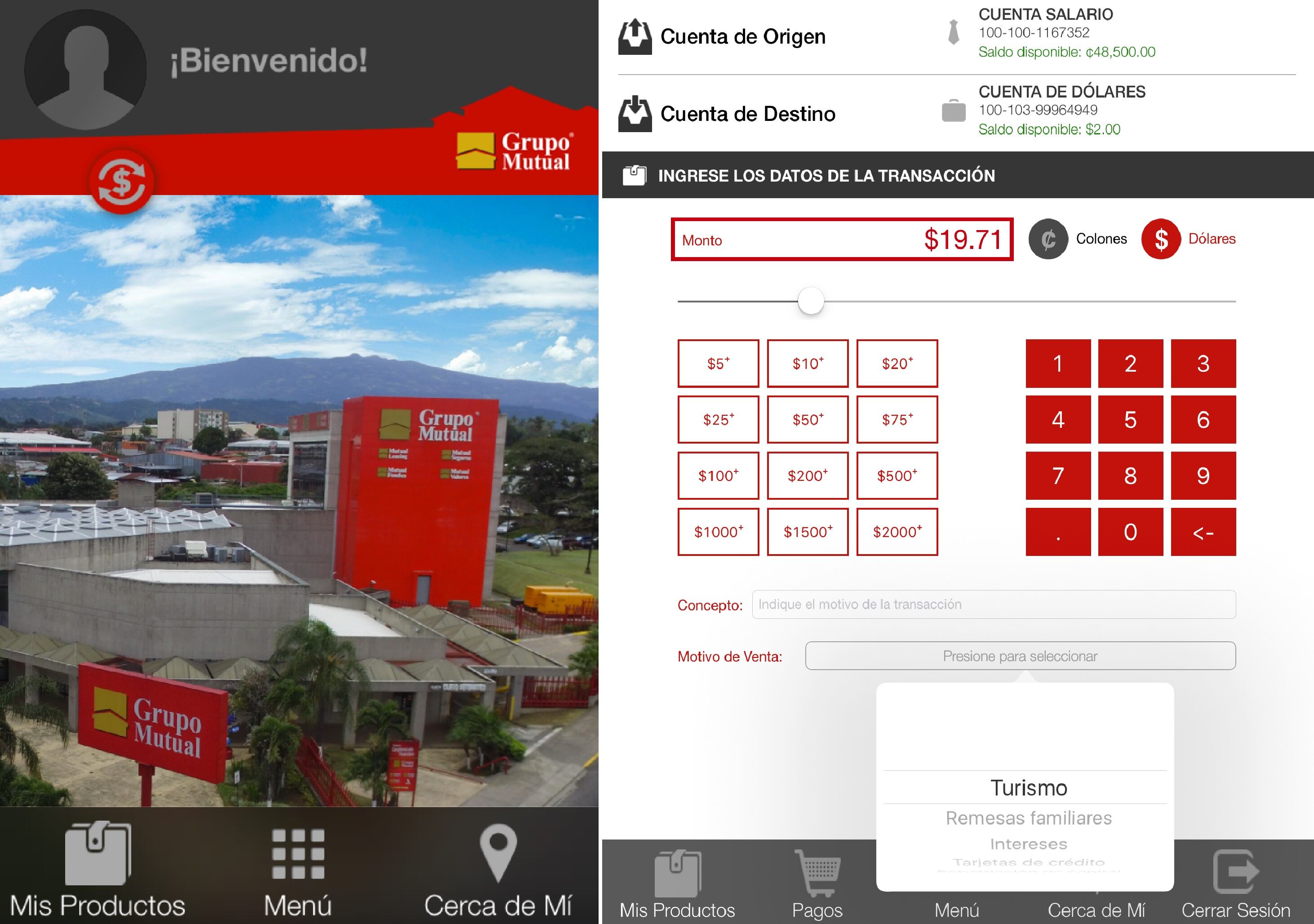 También, transferencias en tiempo real entre cuentas del Grupo Mutual (sin costo) y con otras entidades bancarias (vía Sinpe), así como compra de colones y dólares, traslados de dinero entre cuentas de diferentes monedas y pago de créditos.