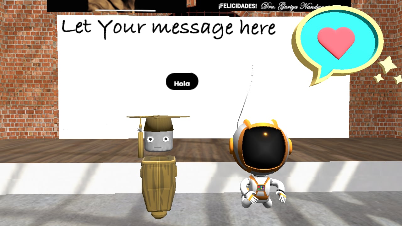 Apenas ingresé me recibió César, a quien conocí no por su cara sino por su avatar: un pequeño astronauta de traje naranja con blanco que flota por el lugar. ¿Mi avatar? Una especie de caricatura de un graduado con toga y birrete. Aquí abajo les dejo un “selfie” de cómo nos veíamos: