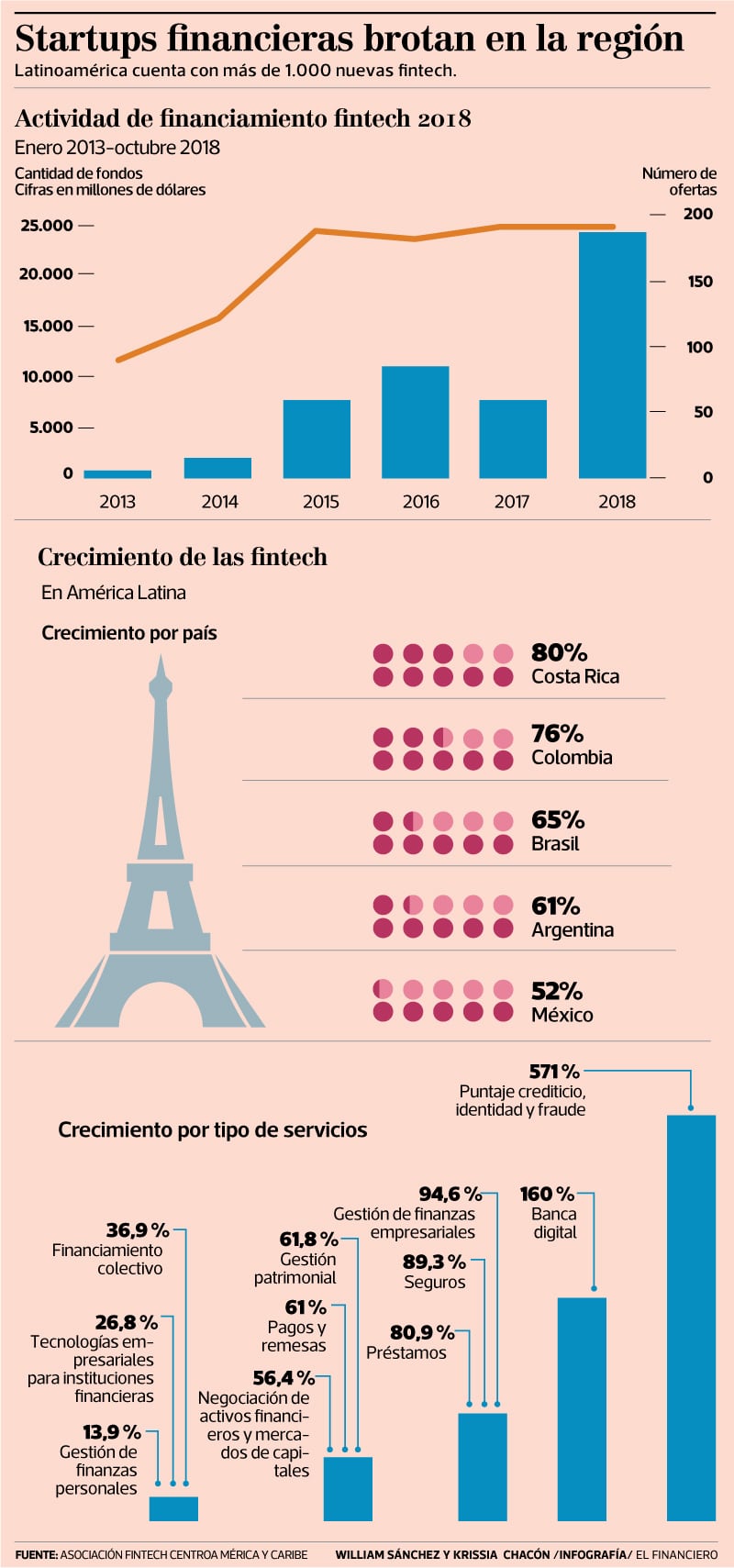 Las fintech en Costa Rica están en efervescencia. Datos de la Asociación Fintech de Centroamérica y Caribe muestran que en el 2018 el país registró el mayor crecimiento de estos emprendimientos tecnológicos en la región con un 80%. Seguido por Colombia (76%) y Brasil (65%).