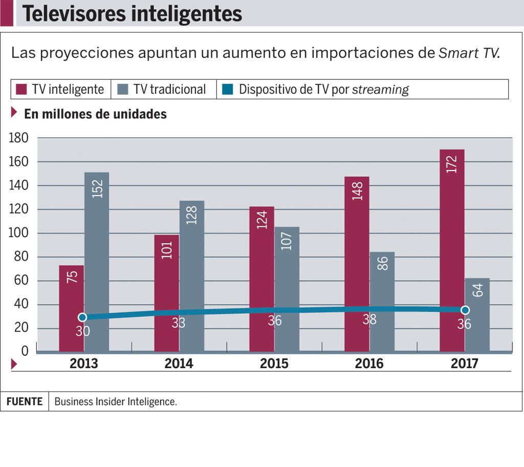 El mismo estudio proyecta que la cantidad de televisores inteligentes (con Internet) que se importarán en el mundo en el 2017 superará por mucho a los televisores tradicionales.