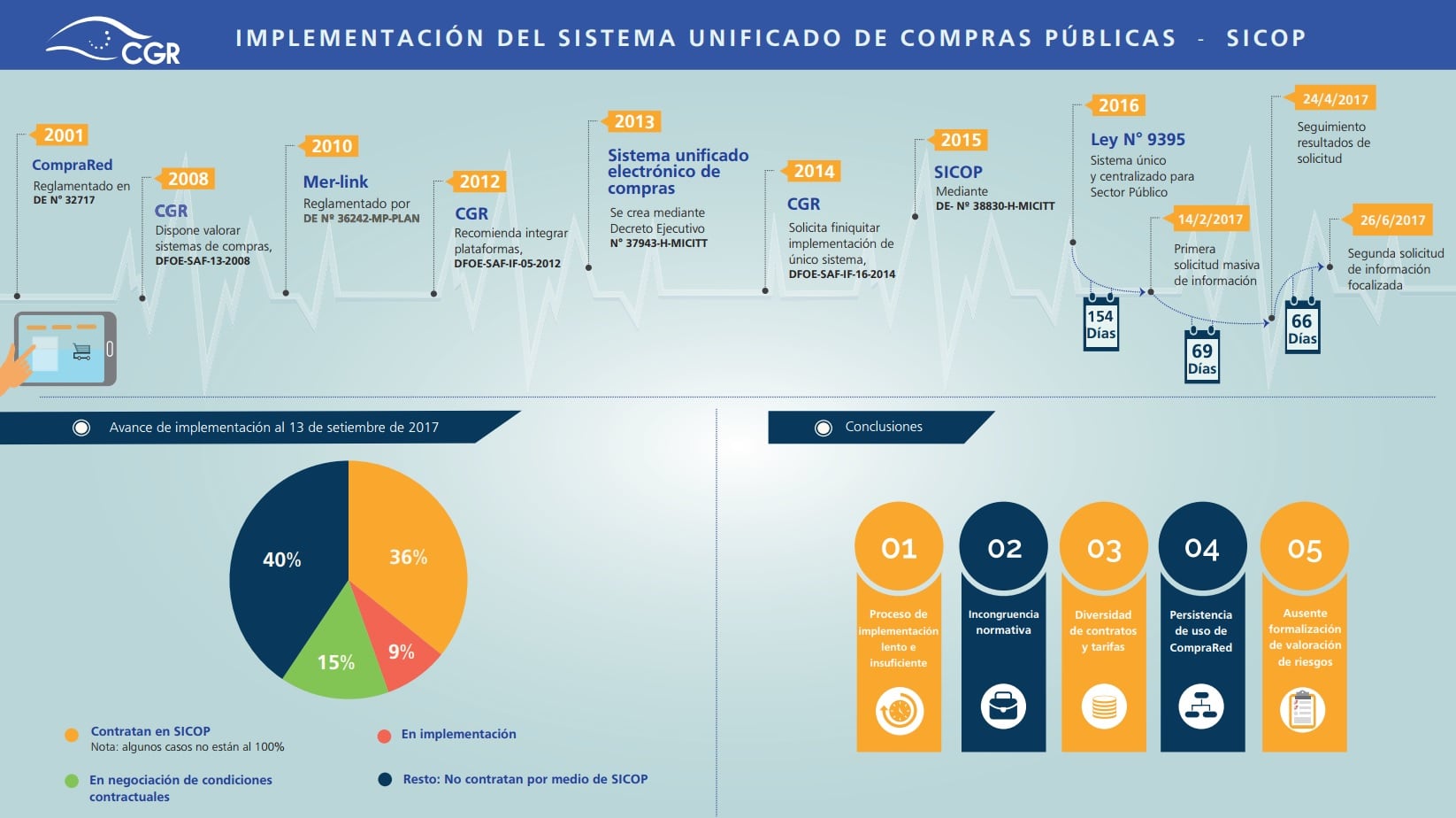 Al 13 de setiembre de 2017, fecha impuesta por la Ley N° 9395 para la incorporación de toda la actividad contractual al Sicop, solamente el 36% de las entidades públicas se encontraban usando el sistema (completa o parcialmente), quedando pendiente un 64%.