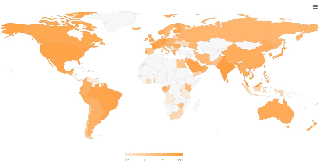 Google indica que, en América Central, Costa Rica está por detrás de Guatemala (9,96%) y Panamá (1,01%) y Nicaragua (0,08%), igual que Honduras (0,02%) y apenas por encima de El Salvador (0,01%).