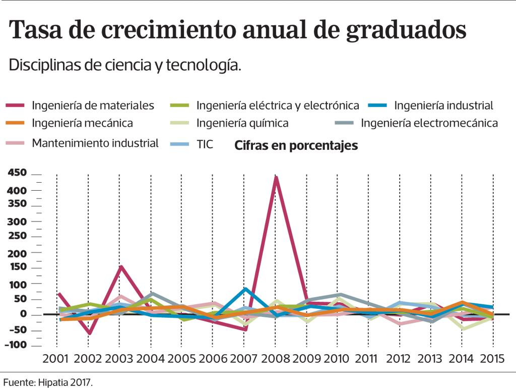 La disciplina de ingeniería de materiales, es la que muestra la tasa de crecimiento promedio anual más alta (37,5%) en cuanto a los graduados en las áreas de ciencia y tecnología.